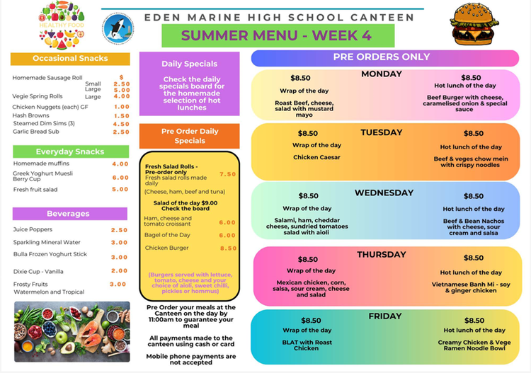 Items can be purchased during recess and lunch or pre-ordered at the canteeen before 11:0am.